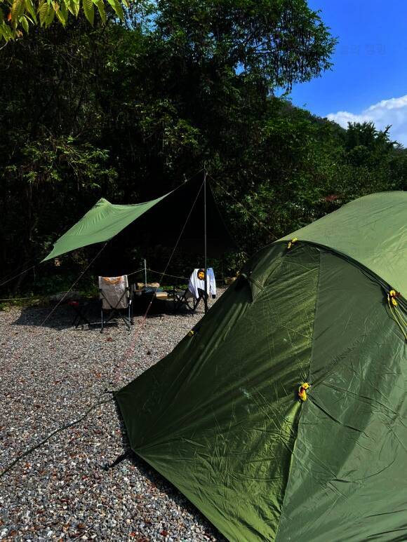 가평 캠핑679 4번사이트 4번 사이트가 양 옆에 다른 텐트가 있어서 불편할 것 처럼 생겼는데 넘 편했다...ㅋㅋㅋㅋ 화장실 가깝고 전기 양쪽으로 하나씩 끌어서 쓰고 바람도 많이 막아준 것 ㅎㅎ 그리고 넓~~~~~다...