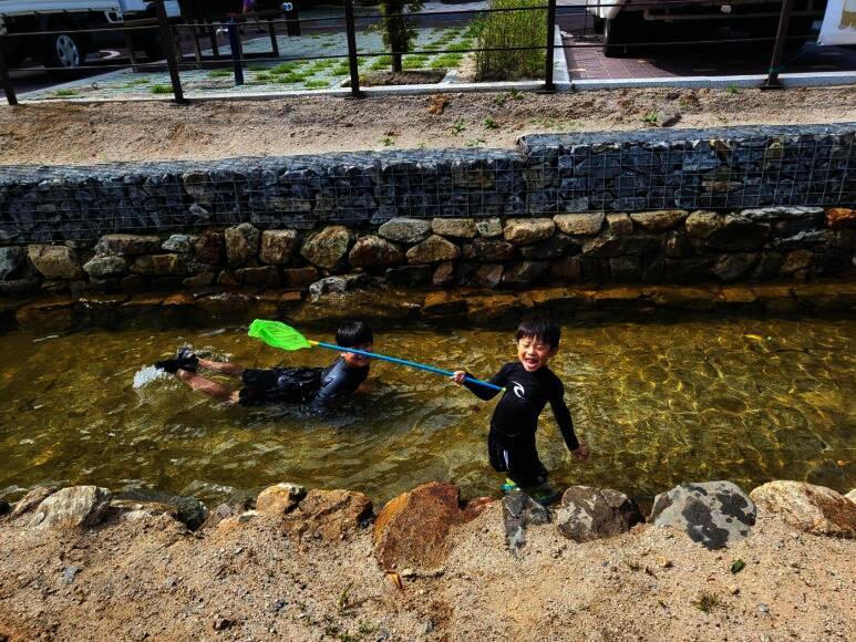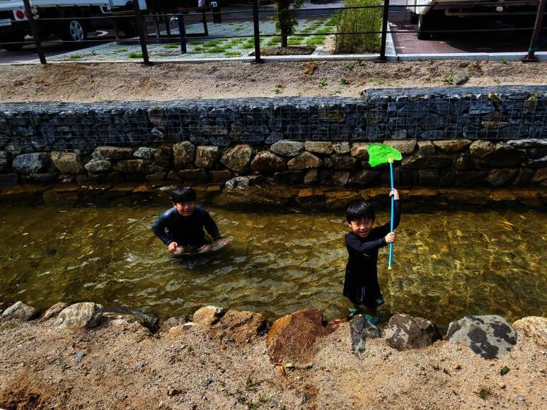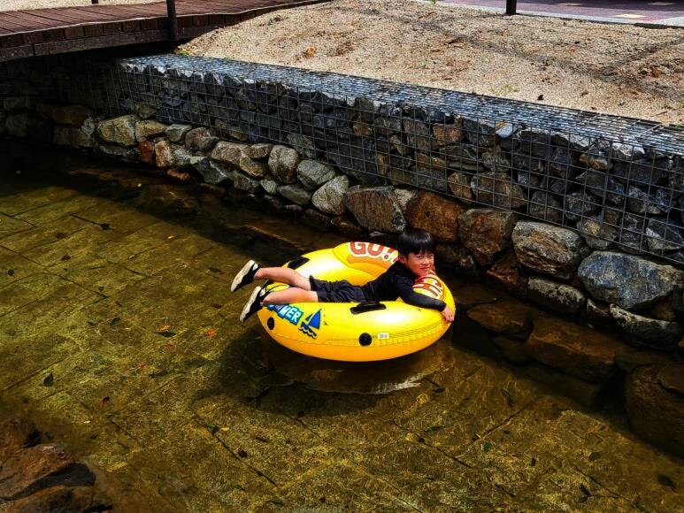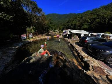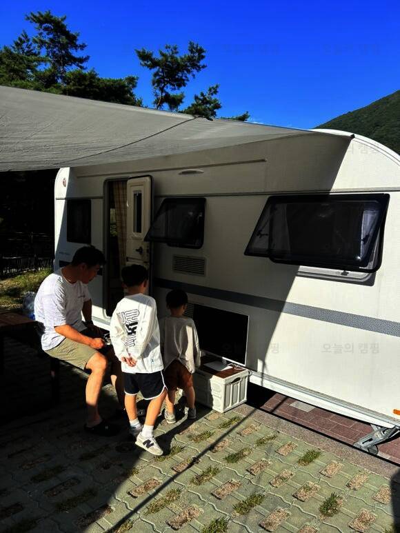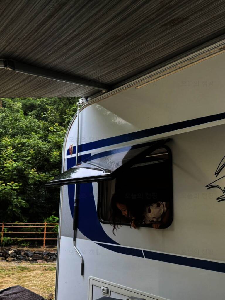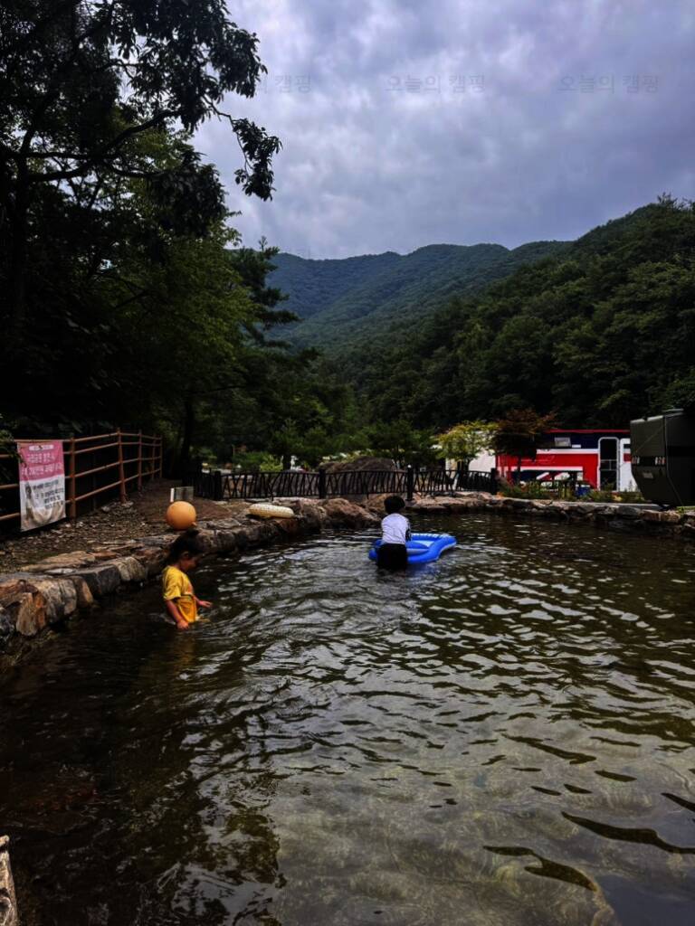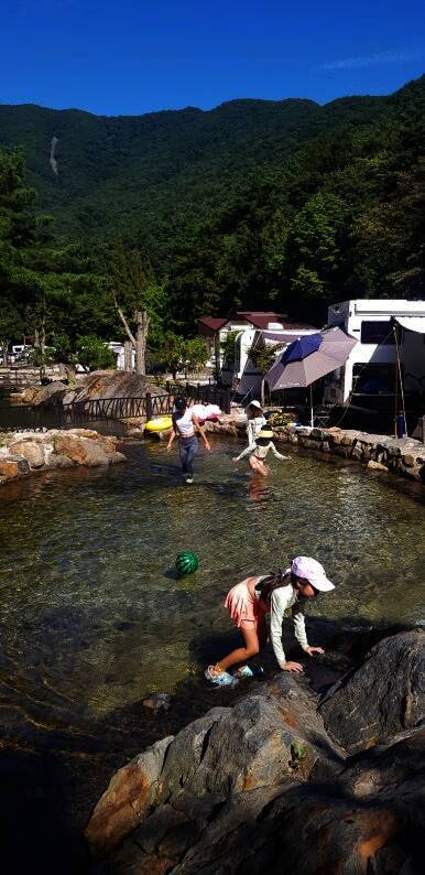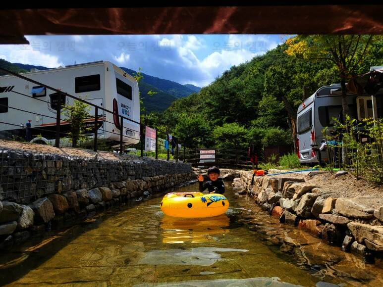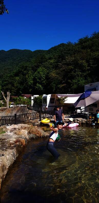 ㅎㅎㅎ 저는 뜬금없이 캠핑카 내부 정리중이고요...^^ 2023년 8월에 다녀온 하선암 카라반 야영장입니다. 잠시 쉬었다가 수영복으로 갈아입고 드디어 입수! 사이트 앞에 개울이 흐르고 있는데 깊지 않아서 아이들...