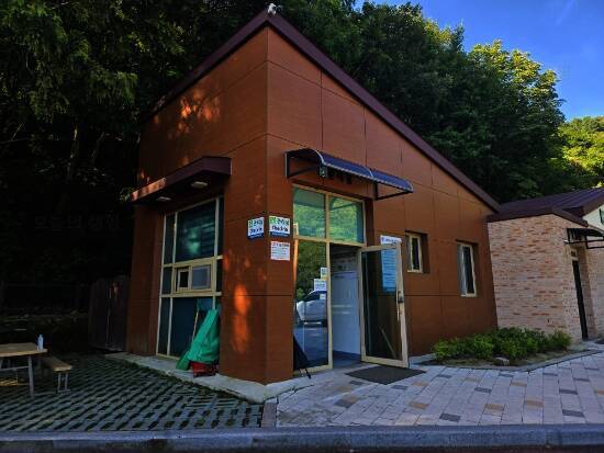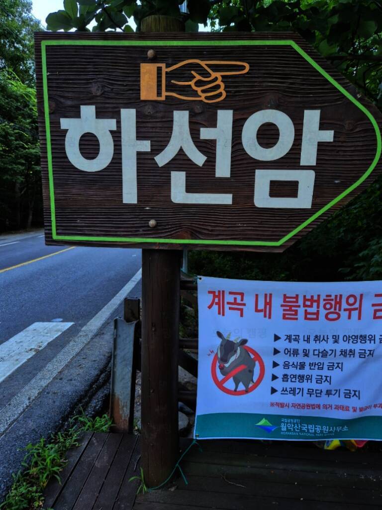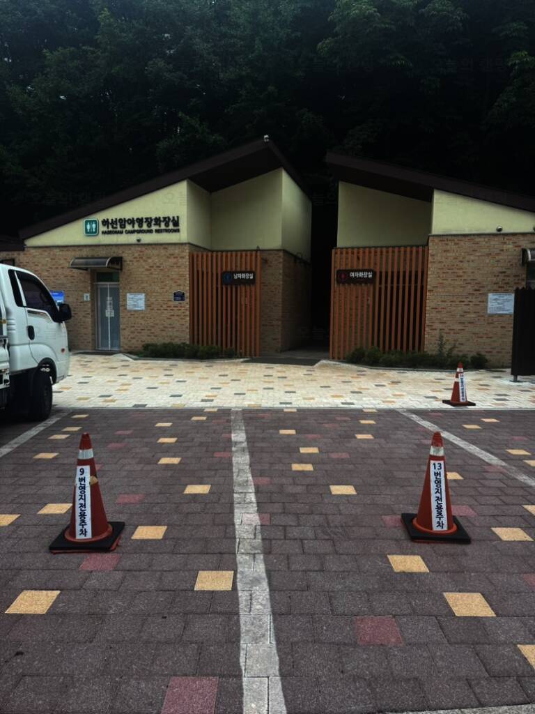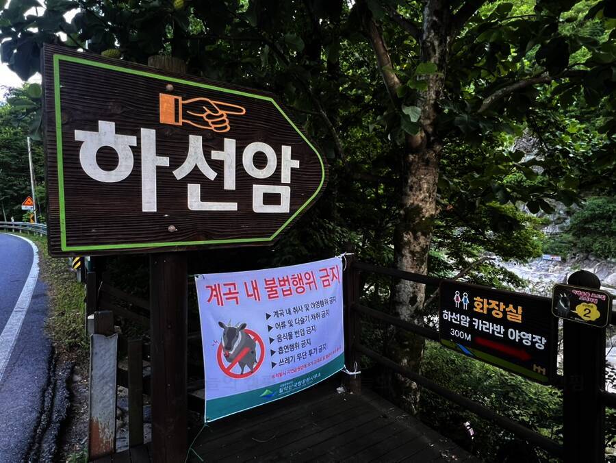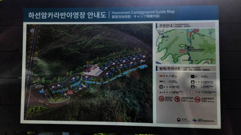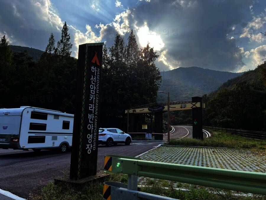 하선암 야영장은 전국에 두 개밖에 없는 카라반/캠핑카 전용 캠핑장이다(나머지 하나는 지리산 학천 야영장) 2시 입실이지만 12시부터는 허용해 주는 것 같다. 신생 캠핑장이라 입구부터 새것 냄새가 물씬...