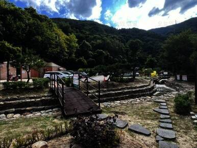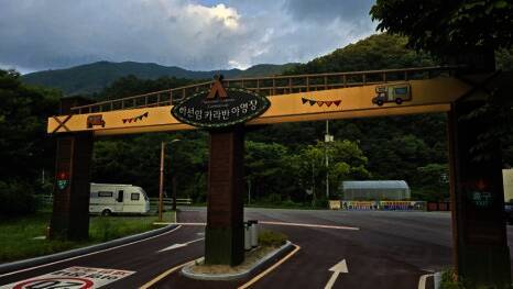 하선암카라반야영장의 입구예요 뭔가 인디언 느낌나게 꾸며놓은 것 같아요 일반 사유지 캠핑장은 보통 5~6만원정도인데 국가가 운영하는 곳이라서 주말 가격도 33,000원으로 저렴해서 엄청 맘에 들었어요 아직...