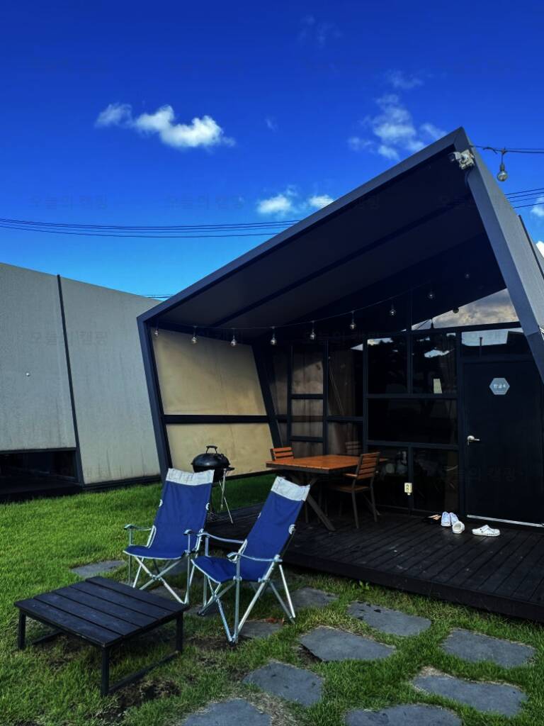 비가 왔지만 너무 즐거운 기억이었던 용장글램핑 소개해드릴게요! 용장글램핑 [주소]경북 경주시... 한글4동 내부 동은 이렇게 되어있고 앞에 캠핑의자가 있고 테라스에서 바베큐를 할 수 있게 돼있고 식탁도...