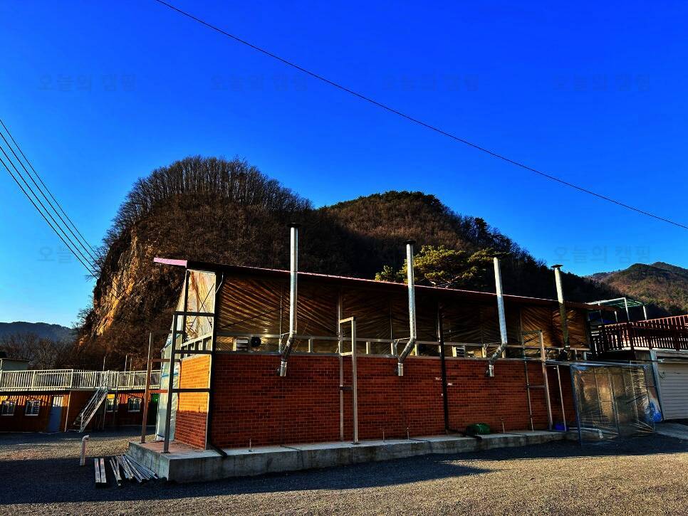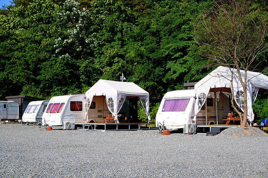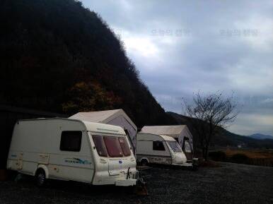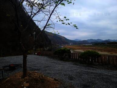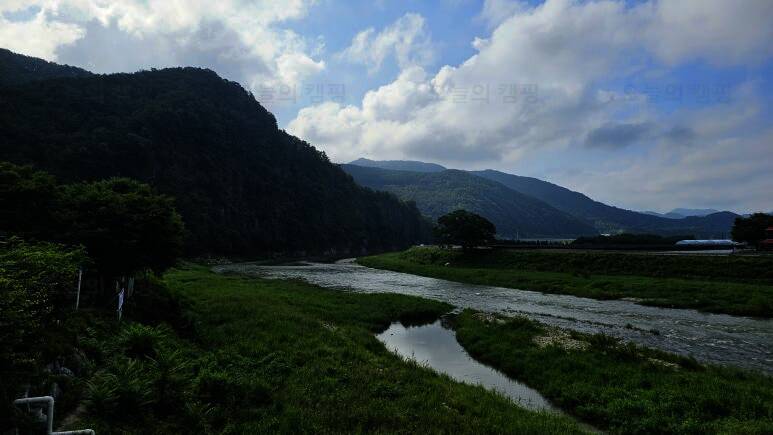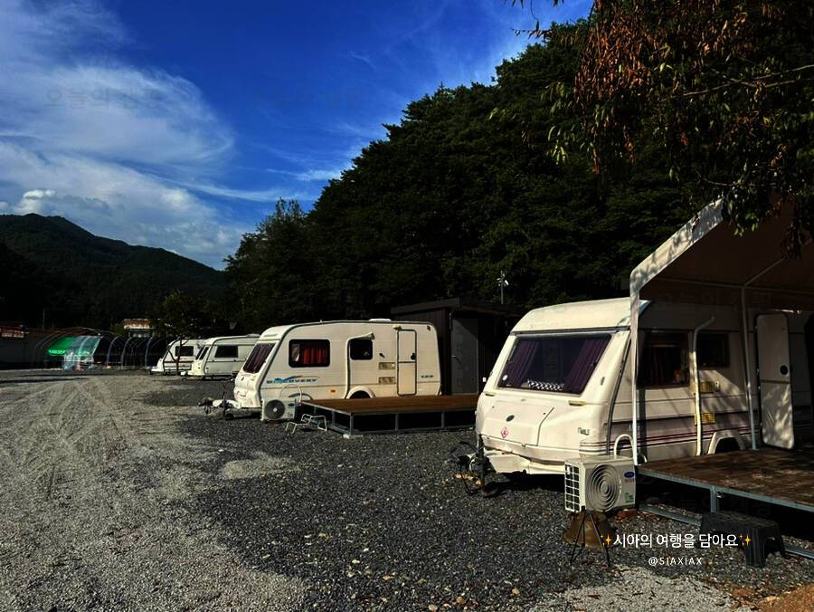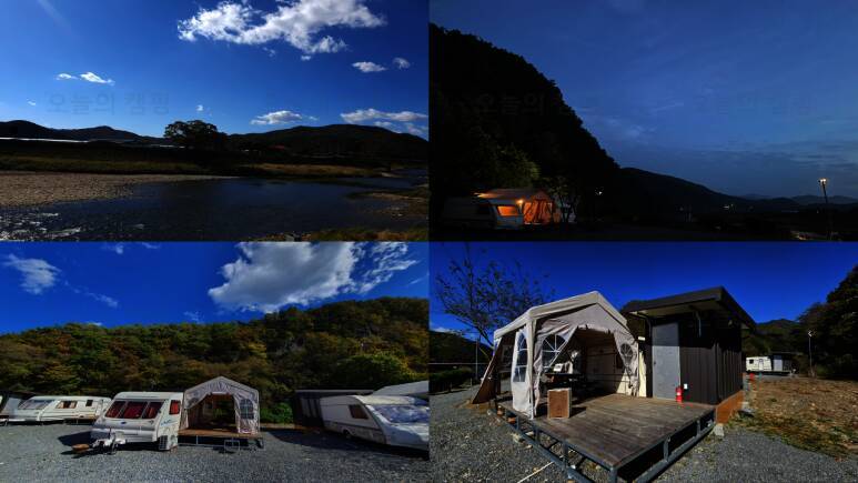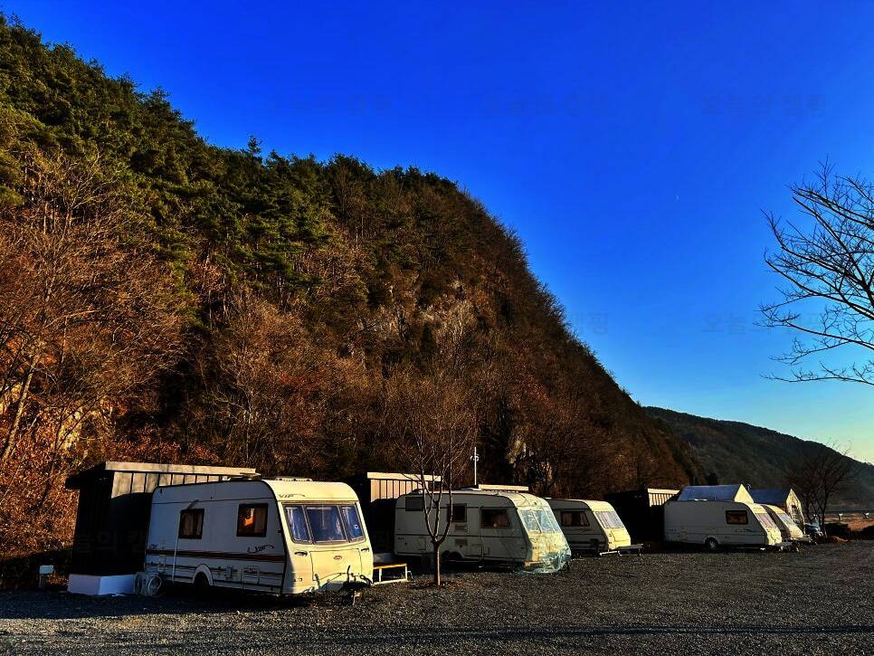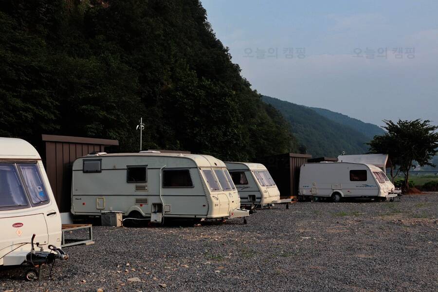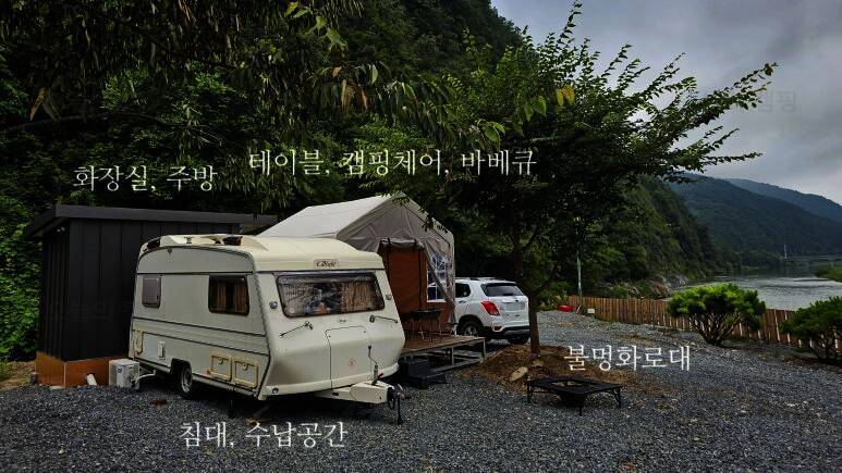 무릉도원 주천강변. 숯가마찜질방을 갖춘 전망좋은 카라반 캠핑장