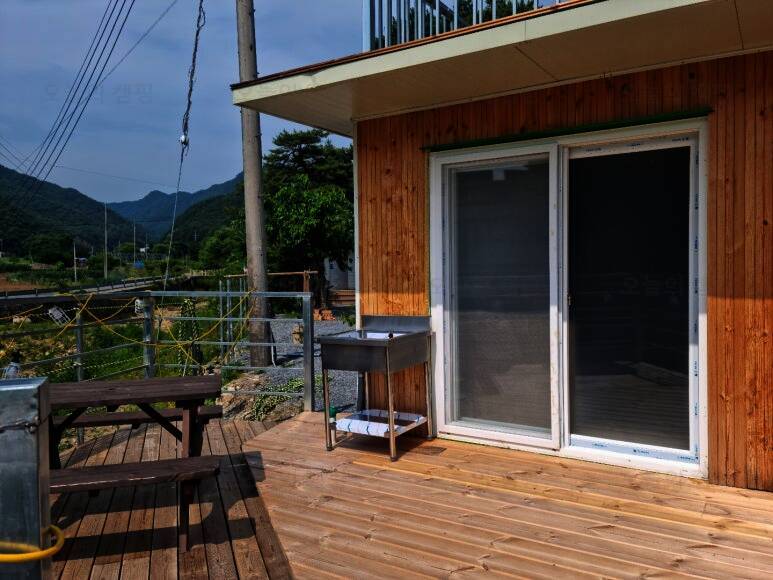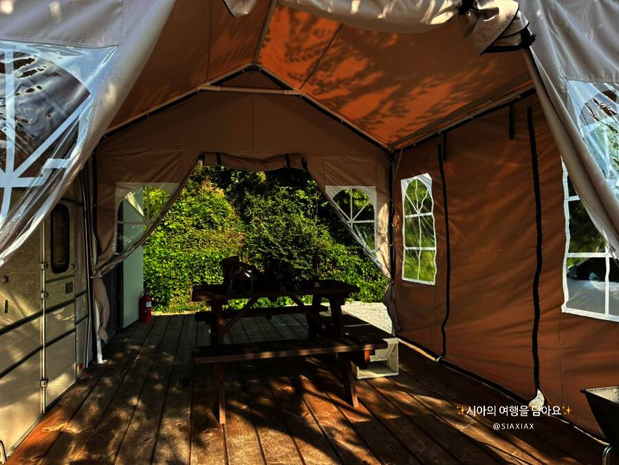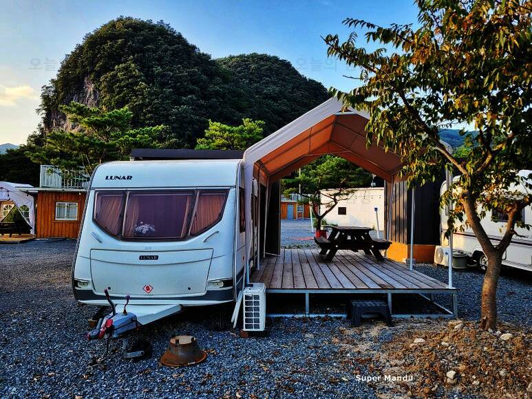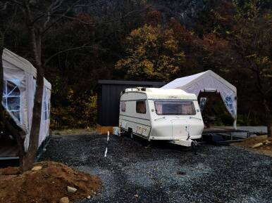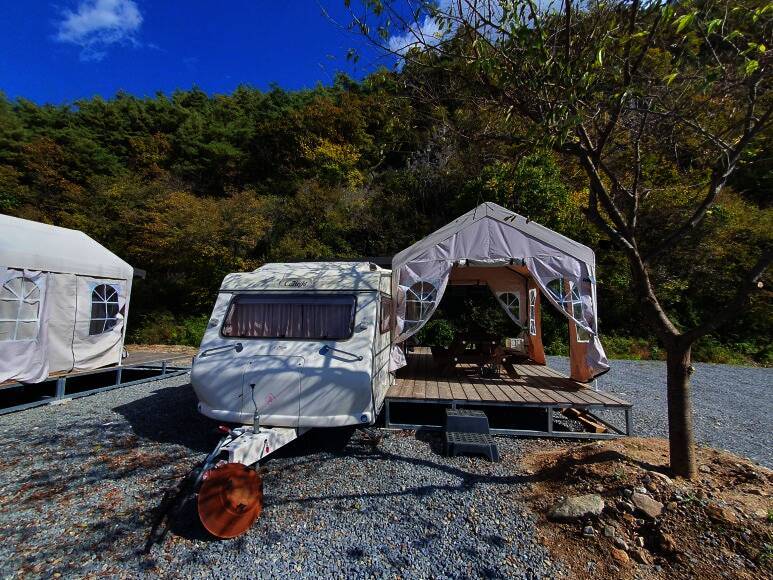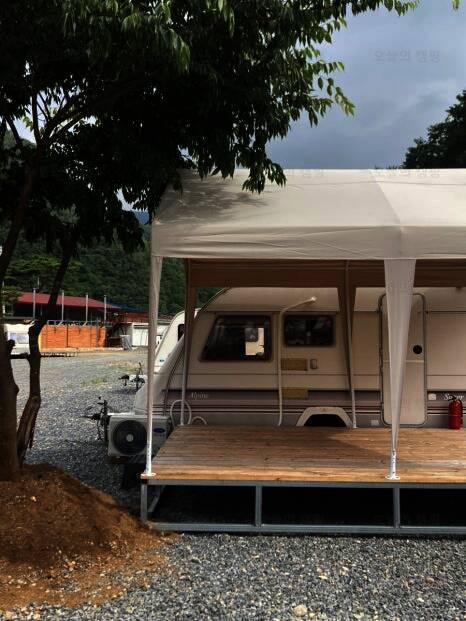 영월캠핑장 리버사이드영월의 카라반 모습입니다. 카라반이 메인으로 전용 데크와 주방과 화장실이 있는 별도의 건물이 있습니다. 카라반...너무 괜찮은데? ㅋㅋㅋㅋㅋㅋㅋㅋㅋㅋ 사실 처음엔 아이들의 니즈에...
