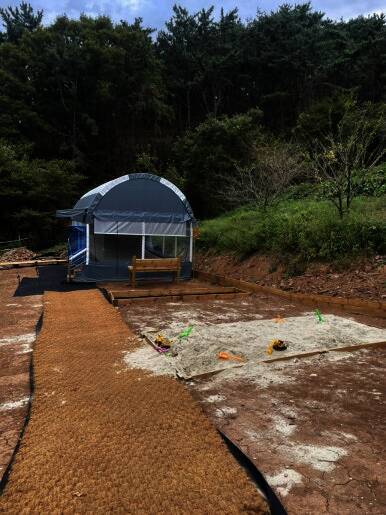 자주 지나가는 길에 있던 캠핑장이어서 언제 한번 와봐야지 했는데 이번에 이렇게 와보네요 :) 큰 나무가 있는 거제GO캠핑 생긴 지 얼마 안된 캠핑장이어서 시설도 아주 깔끔했어요. 트램폴린도 왠지 경사가 있어...