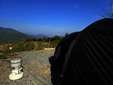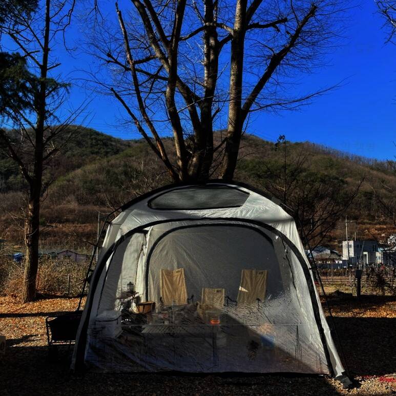 키즈 캠핑장 에르젠 파이어 쉘터 개방감 진짜 대박 해지는 것도 구경했어요 해질녘 뷰 보려고 캠핑다니... 겨울엔 더 파랗고 예쁜 하늘에 앙상한 나무 보는 재미도 있어요 그래도 역시 동계캠의 제일 좋은 점은...