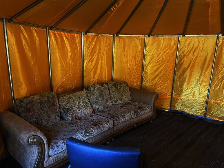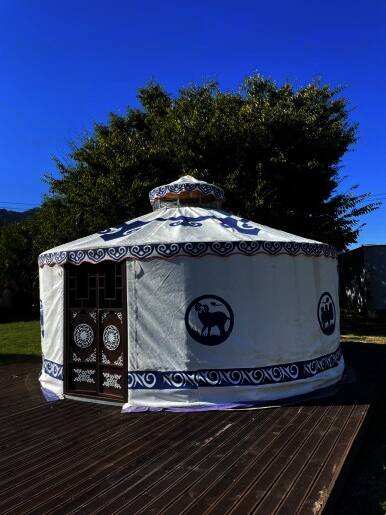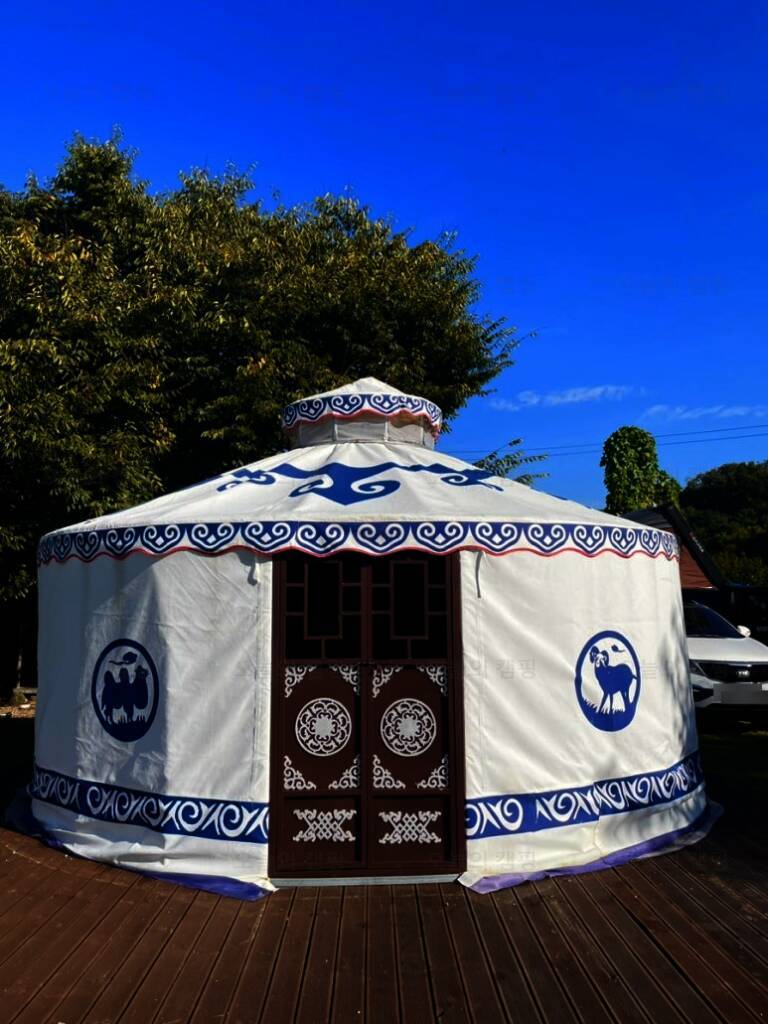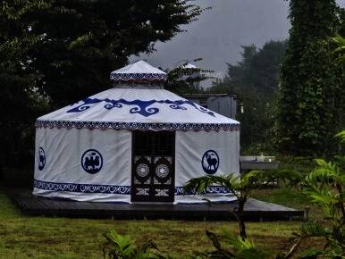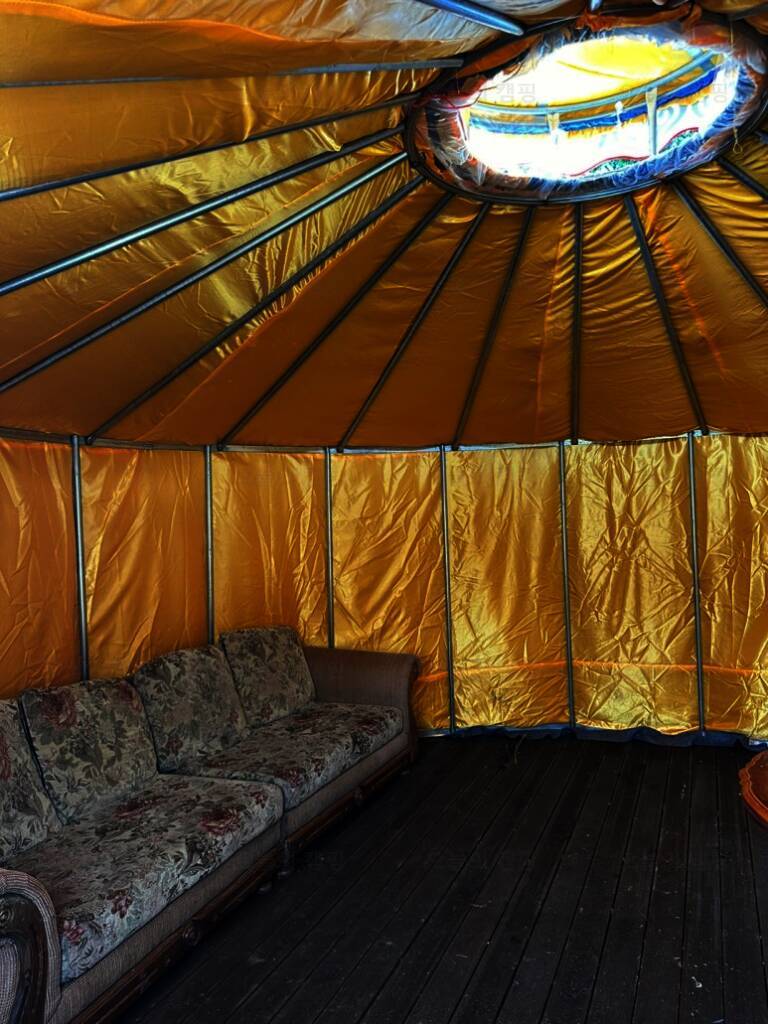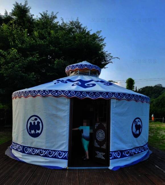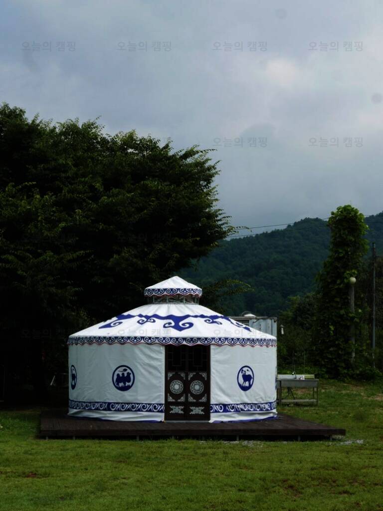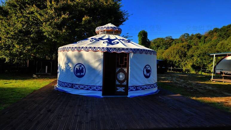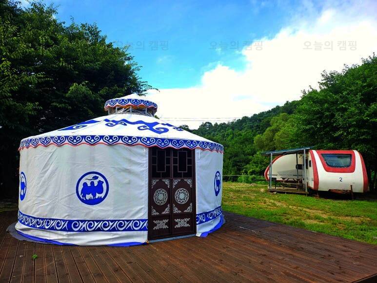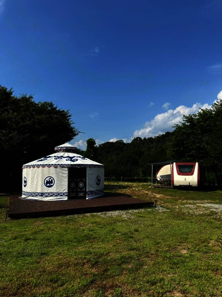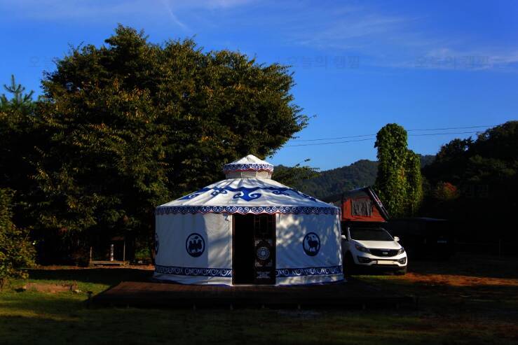 카라반과 글램핑 캠핑을 즐길 수 있는 울란팍카라반 캠핑장에 도착! 캠핑장 가운데, 몽골식 탠트가 하나 놓여져 있습니다. 내부는 이렇게 생겼습니다. 가볍게 담소 나누기 좋은 공간입니다. 경기도여행...