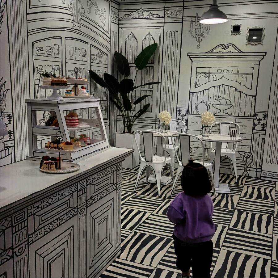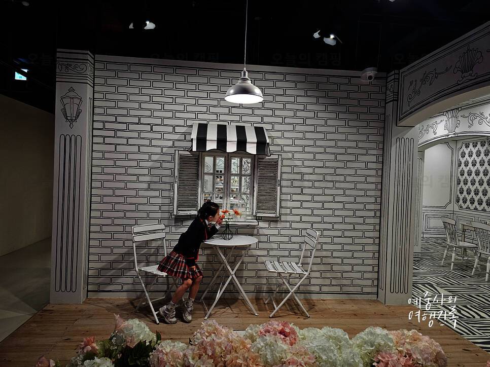 캠핑&피크닉 컨셉의 아기자기한 공간부터 제법 칠-한 다채로운 색으로 채워진 공간과 또 한편의 미디어아트 전시를 감상하듯 화려한 조명&거울로 채워진 빛의 공간 2D로 입체적이게 표현한 그림 카페까지...