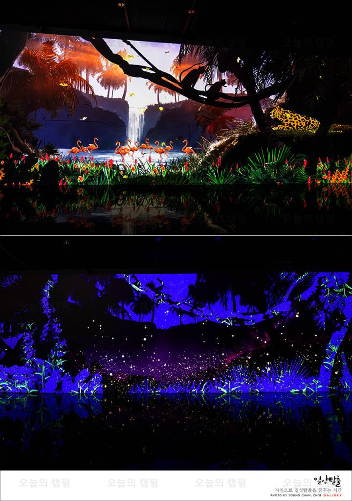 가족사진 찍기에 너무 좋다 사랑비가 내려요❤️ 캠핑포토존은 실재로 캠프닉 온것 같은 기분을 낼... 미디어 아트를 결합'한 독특한 공간이다. 정글미디어파크의 주요 attractions 중 하나는 미디어 아트...