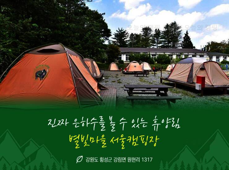 [서울속캠핑장 6편] 별이 쏟아지는 밤하늘을 볼 수 있는 횡성 별빛마을 서울캠핑장을 소개합니다. 횡성 별빛마을이 위치한 횡성군 강림면 월현리 지역은 우리나라 최초의 ‘별빛보호지구’로 높은 하늘과...