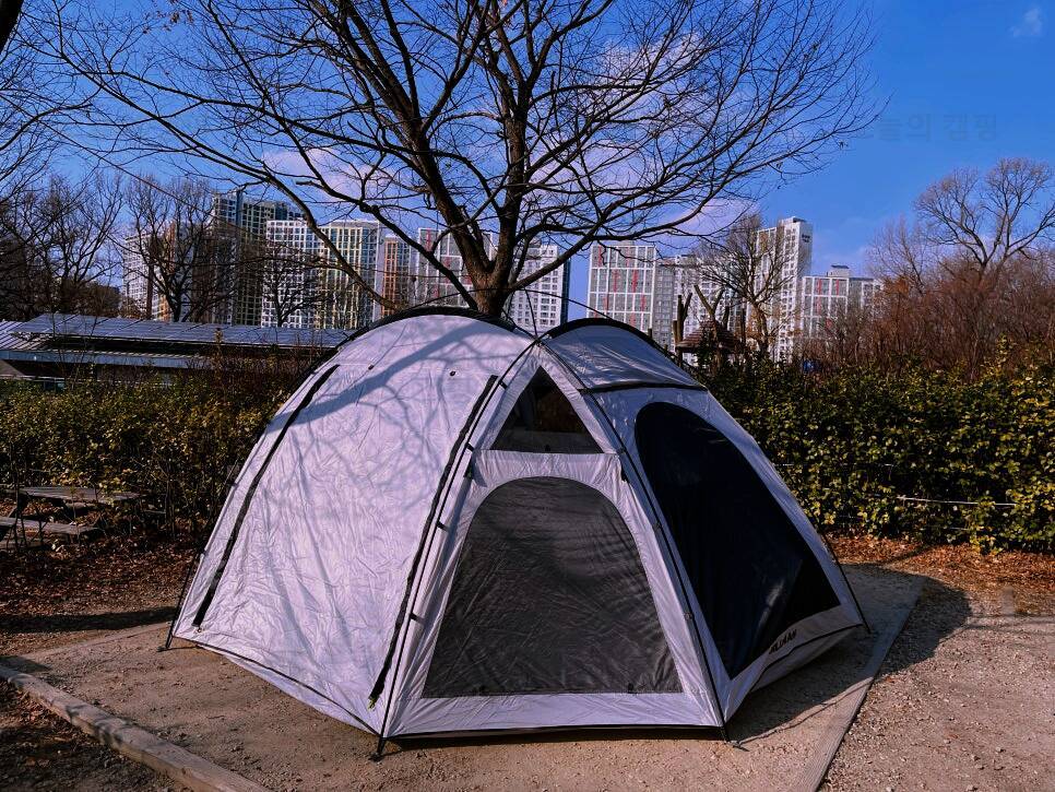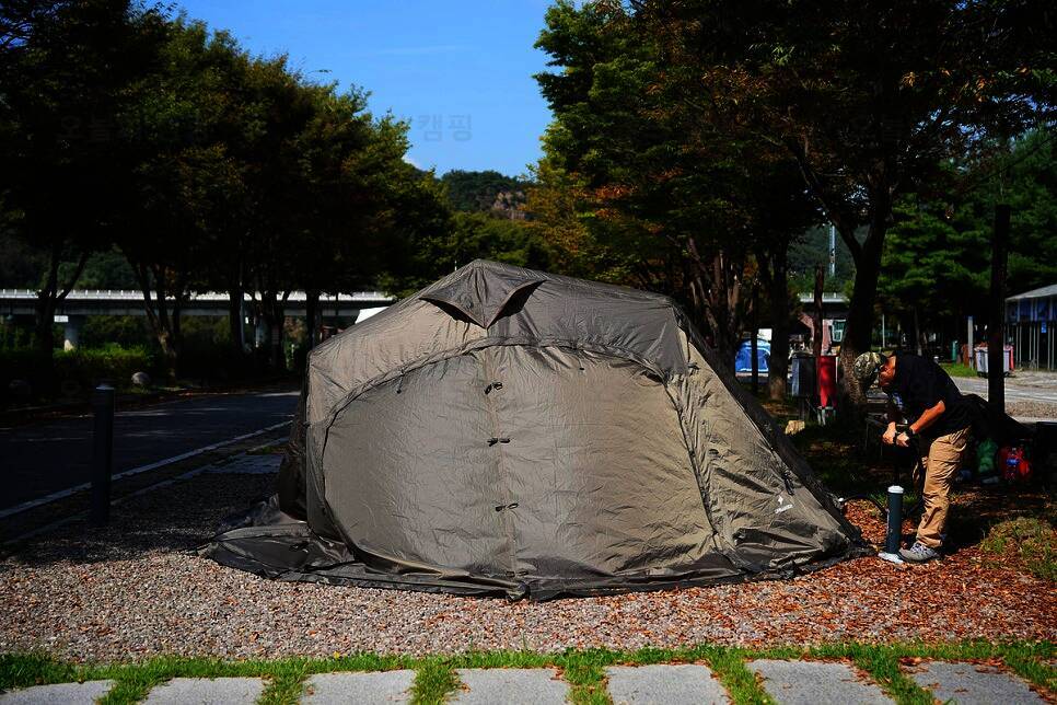 그래서 트렁크가 그렇게 꽉 차있었구나 싶었고요 ㅋㅋ 중랑캠핑장의 악명은 익히 들어왔지만 역시. 흙바닥에 1차로 기겁하고 ....... 사이트 모양에 새삼 감탄하며 힐맨 벙커돔을 쳐봅니다. 저희 자리는...