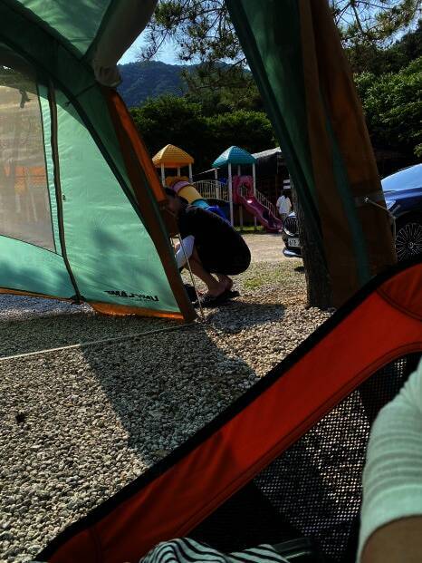 예약 아주 잘했어 오빠 칭찬해 ~~~ 이때도 6월초 였나 너무너무 더웠지만 아이는 바로 앞 놀이터에서 잘 놀고 있기에 맘편히 의자앉아서 쉬어가며 캠핑정리를 합니다! 가래골농원캠핑장 놀거리는 이게 다...