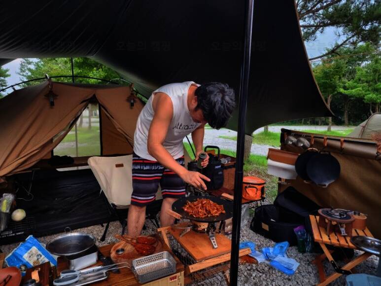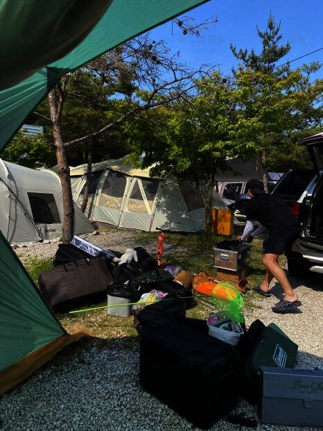 당연히 캠핑가야죠. 퇴근하고 부랴부랴 포천으로 달려갑니다. 차가 막히지 않아서 1시간 정도 걸려서 6시반 도착! 하얀악마형이 쉬는 날이라 자리 잡아놓고 계십니다. 카키와 원목에 진심인 형. 감성캠핑에...