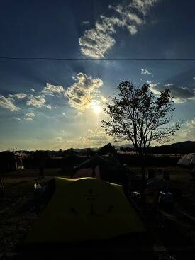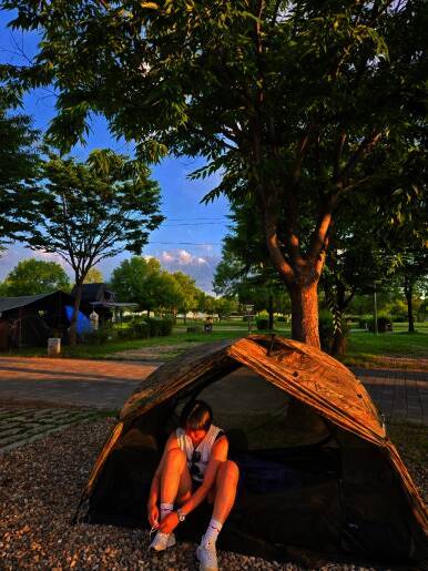 금요일에 연차를 쓰고 캠핑장에 다녀왔어요 삼대가 덕을 쌓아야 올 수 있다는 디투.. 금 토 일 2박 3일... 황석산오토캠핑쟝 예쁜 첫날밤이 저물었다,..⭐️ 브이~~~ ㅇ0ㅇ 아침에 기상해서 오빠가 사준 책 읽기...