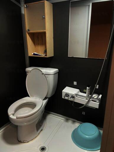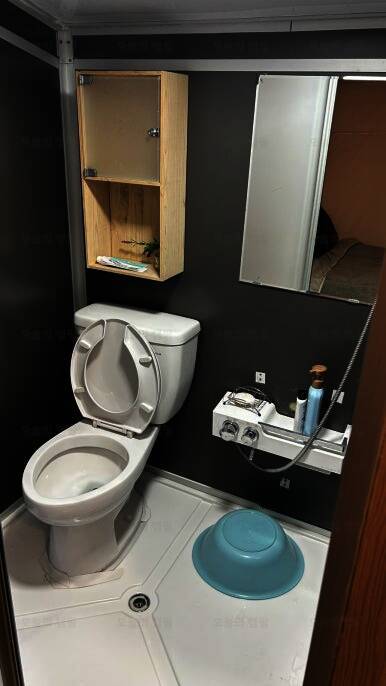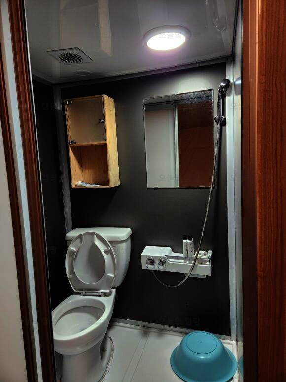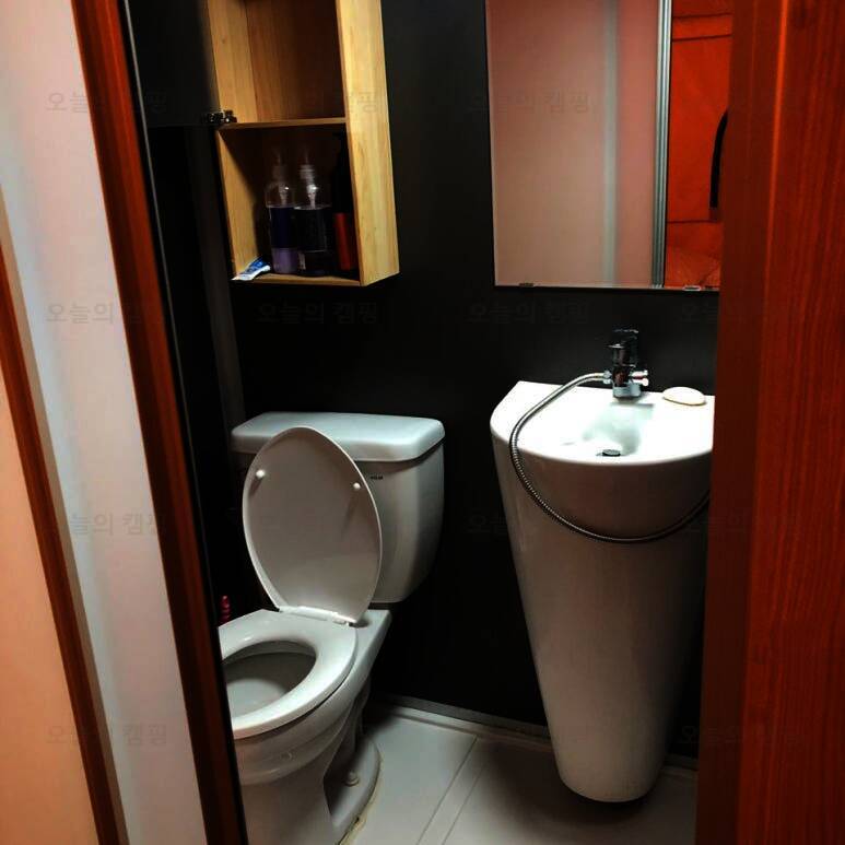 화장실 내부의 사진 내부에는 간단한 세면도구 있어요 매점에는 과자 숯등등 구매가 가능 글램핑엔 역시 고기죠 고량주와 홍시주도 한잔 새우도 잘 구웠습니다잉 #주노글램핑광주 #상무지구캠핑...