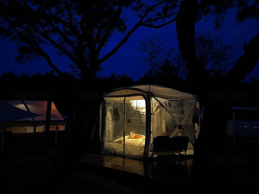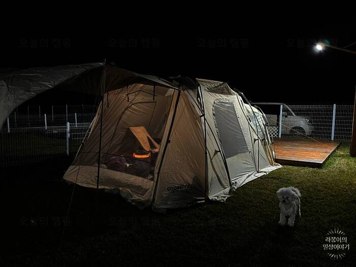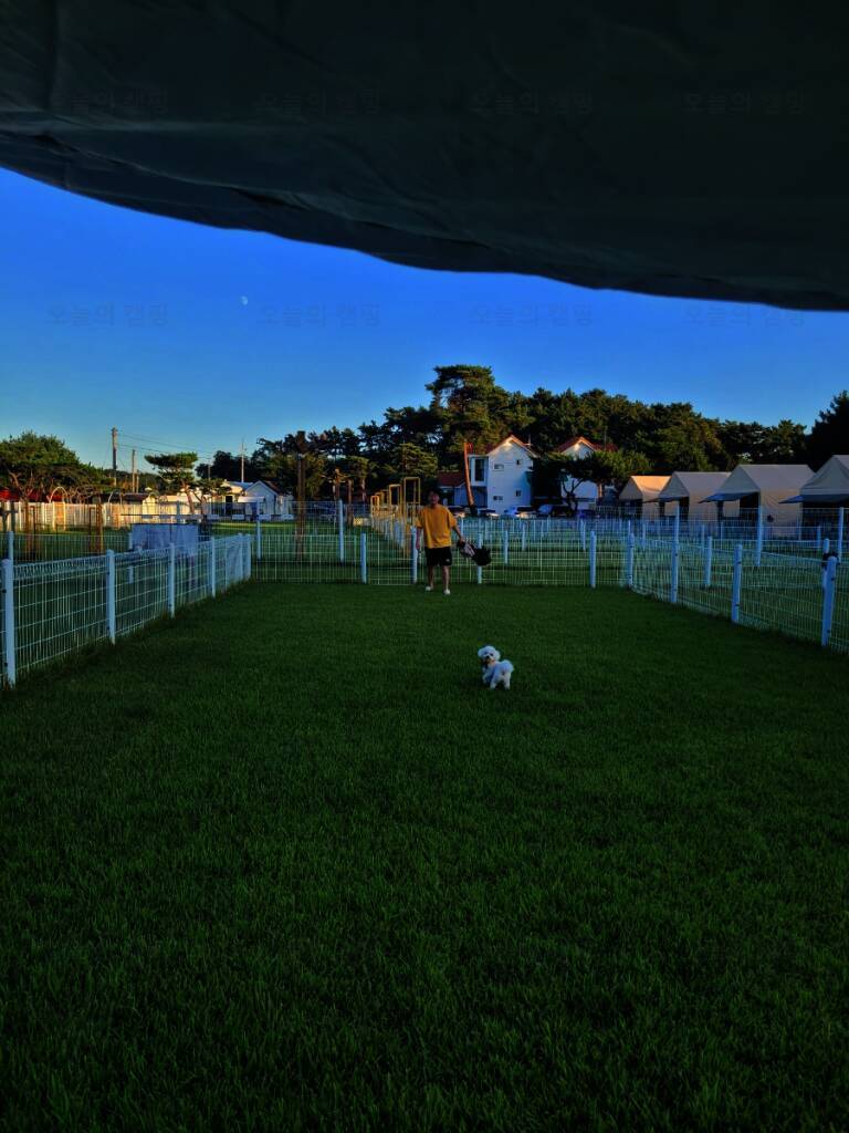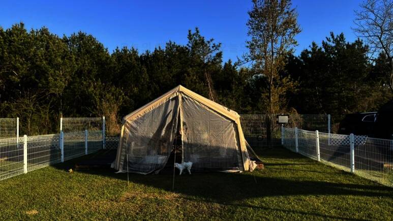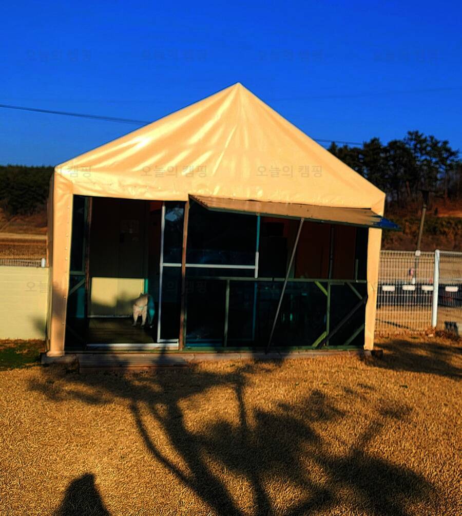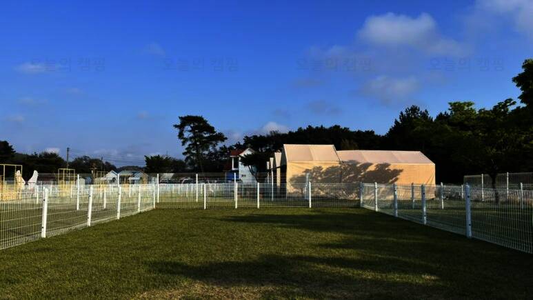 드넓은 잔디밭에 펼쳐진 반려견 전용 글램핑