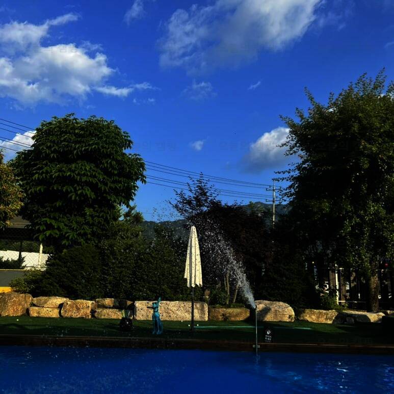 포천시는 이름에 이미 ‘천’이 들어가 있는데, 역전앞 처럼 ‘포천천’이라는 강의 이름이 흥미롭다 #아지트캠핑 카라반이 두대가 있다 인조잔디가 깔린 길을 조금만 걸으면 #글램핑 장이 나온다 느티나무들...