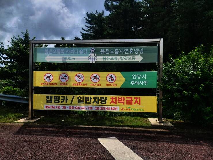 휴무일에는 "붉은오름 자연휴양림" 숲속야영장을 다녀왔습니다 저와 같은 야영초보자들을 위한... 입구입니다 캠핑카나 일반 차량을 이용한 차박은 금지되어 있어요 야영장 주변에 오름이 많아서 날씨가...