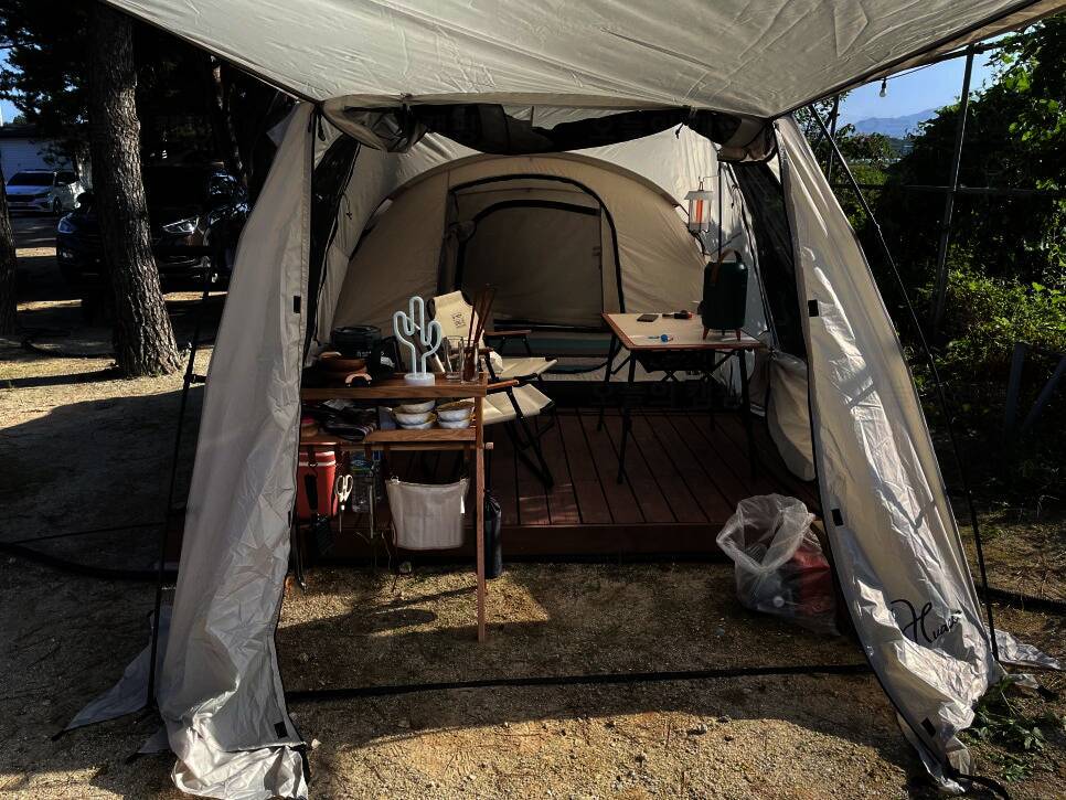 고성 쭌 캠핑장 장소 : 고성 쭌 캠핑장 일자 : 2021년 10월 2일 ~4일 (2박 3일) 사이트 : 7번(데크/정확히... 아이러니하게도, 첫 캠핑에 순조로웠음을 느끼고 미니멀 웍스 바나나를 지인에게 줘버렸다. 더 큰 텐트를...