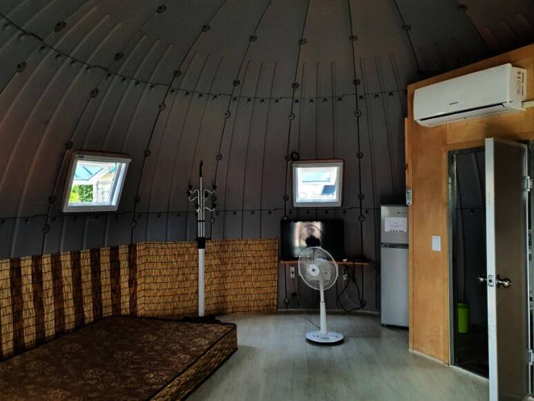 강원도 고성 캠핑장으로 소개해드리는 쭌 캠핑 펜션 이곳은 캠핑장만 하는 곳이 아니라 펜션, 카라반도 함께 운영하는 곳이었어요. 위의 사진 가운데 돔 형태의 숙소도 있더라고요. 스노클링을 하기 위해 아야진...