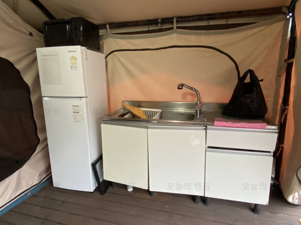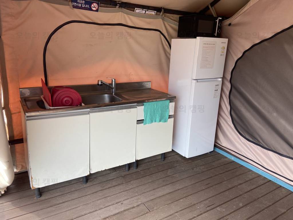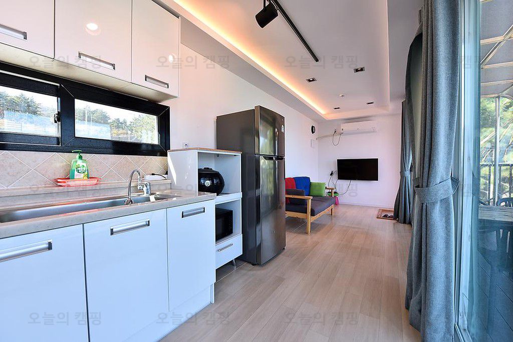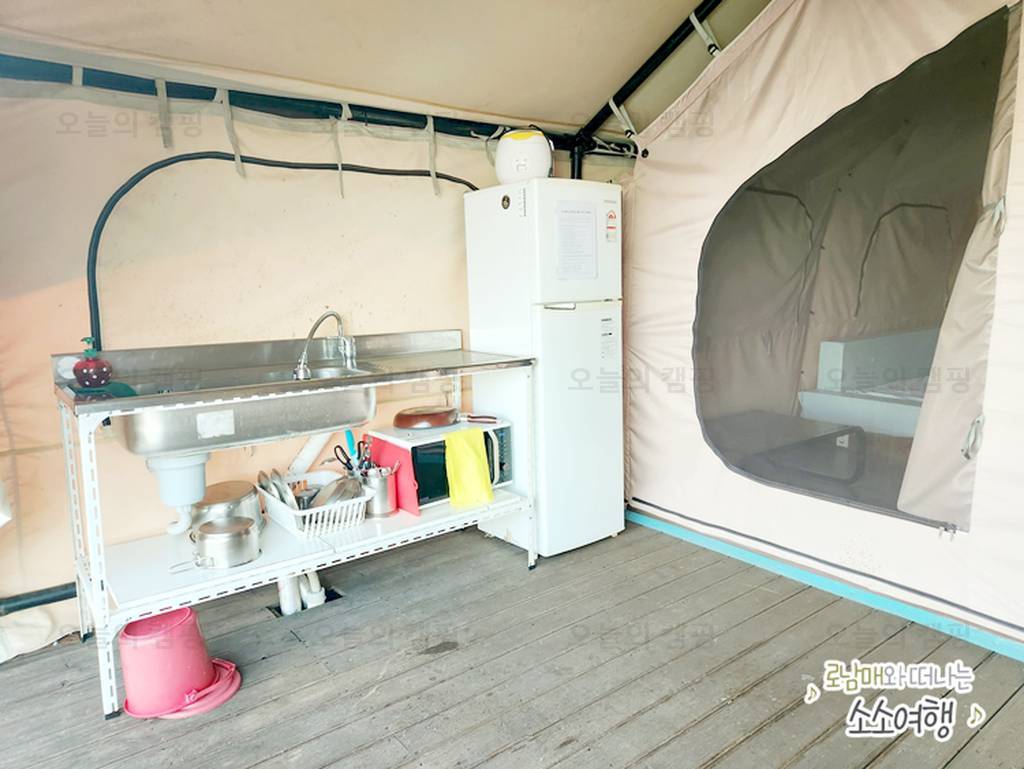 gkl가족나들이 블루웨일 캠핑장의 아쉬운 점은 글램핑장에 개별 샤워시설및 화장실 없어요. 찜질방, 사우나 시설이 있어 그곳에서 씻어야하니 조금 아쉬웠어요. 글램핑 내부 둘러보기- 주방 글램핑장은 꽤나...