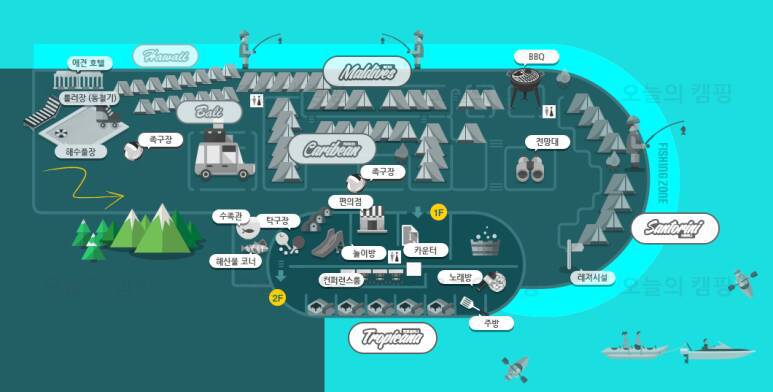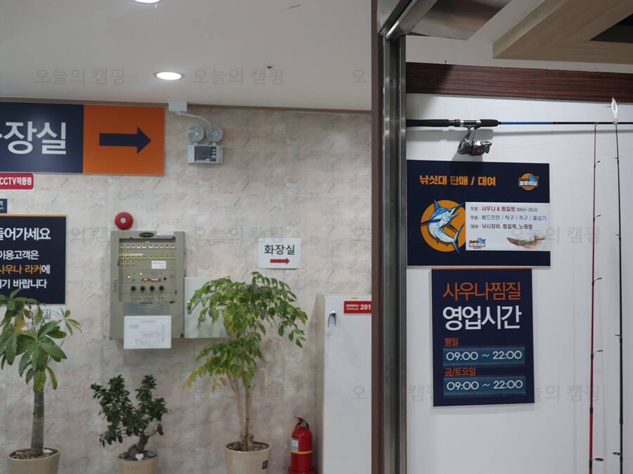 식당, 화장실, 취사장, 수영장, 족구장, 찜질방, 연기감지기, 편의점, 소화기, 샤워실