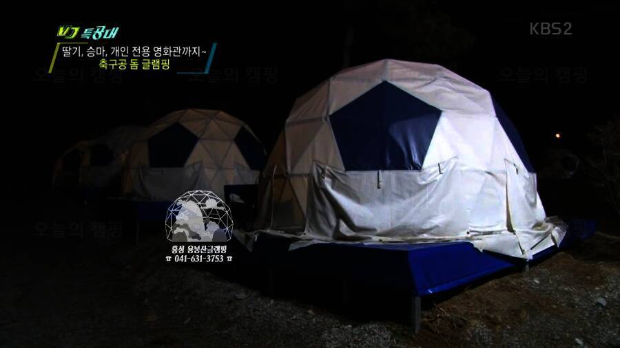 별별 겨울 캠핑"편 축구공돔글램핑 홍성 용봉산 글램핑 시작합니다~~~~~~ 홍성 용봉산글램핑 캠핑장의 모습이 보이시죠? 축구공을 닮은 돔텐트가 매우 이색적입니다~~~ VJ특공대에 나오는 모습이 너무...